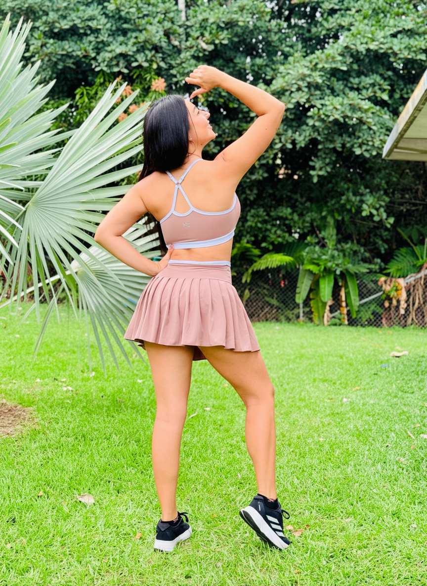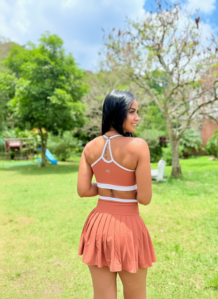 Descubre la combinación perfecta de estilo y funcionalidad con este conjunto deportivo. La falda short , confeccionada en tela nylon y spandex, ofrece comodidad y libertad de movimiento, mientras que su short interno con bolsillo te brinda practicidad y seguridad en cada paso. El top de tela nylon con soporte medio y copas integradas asegura un ajuste cómodo y firme para que te sientas confiada durante tu rutina. Eleva tu entrenamiento con un conjunto diseñado para acompañarte en cada desafío.